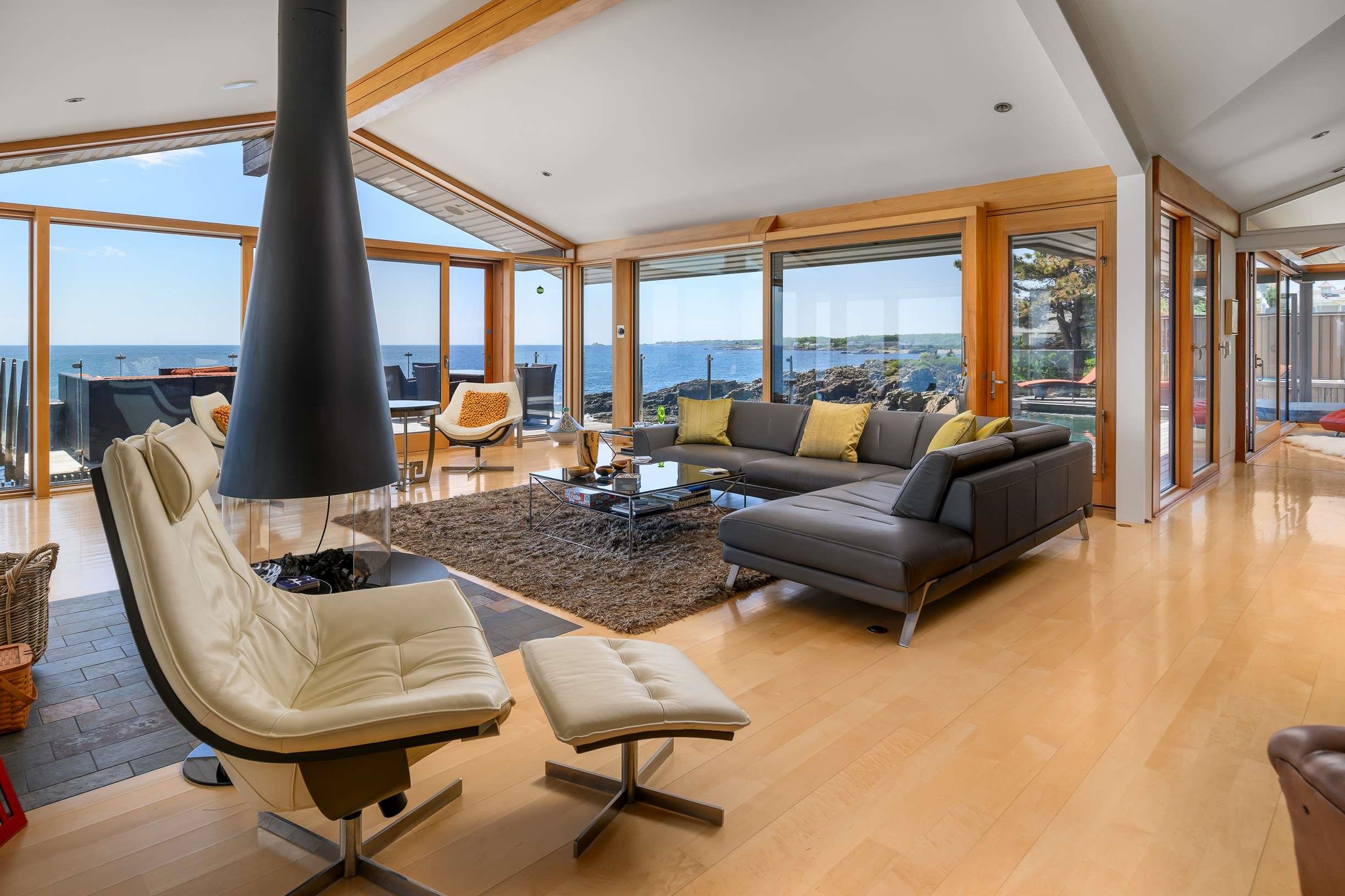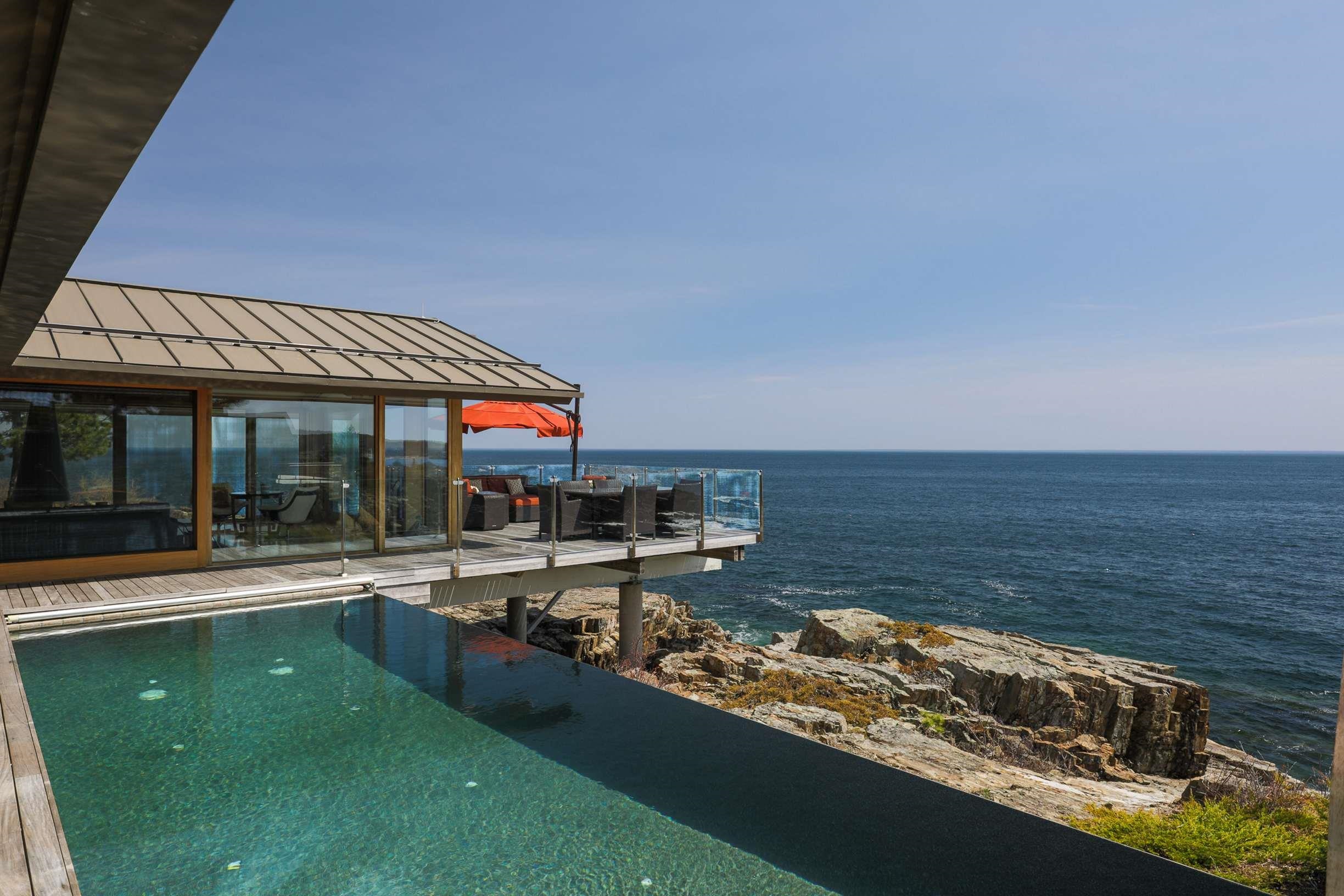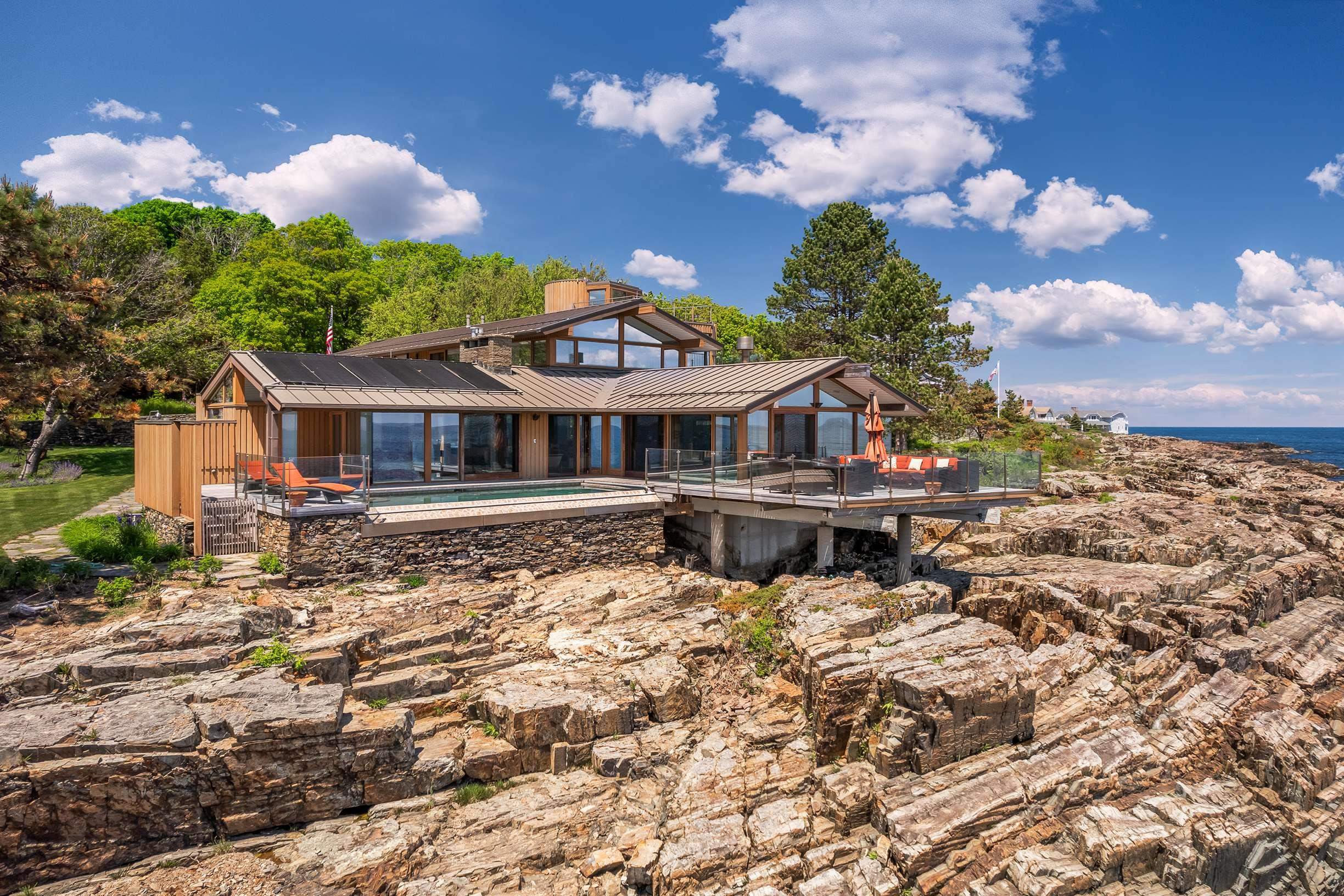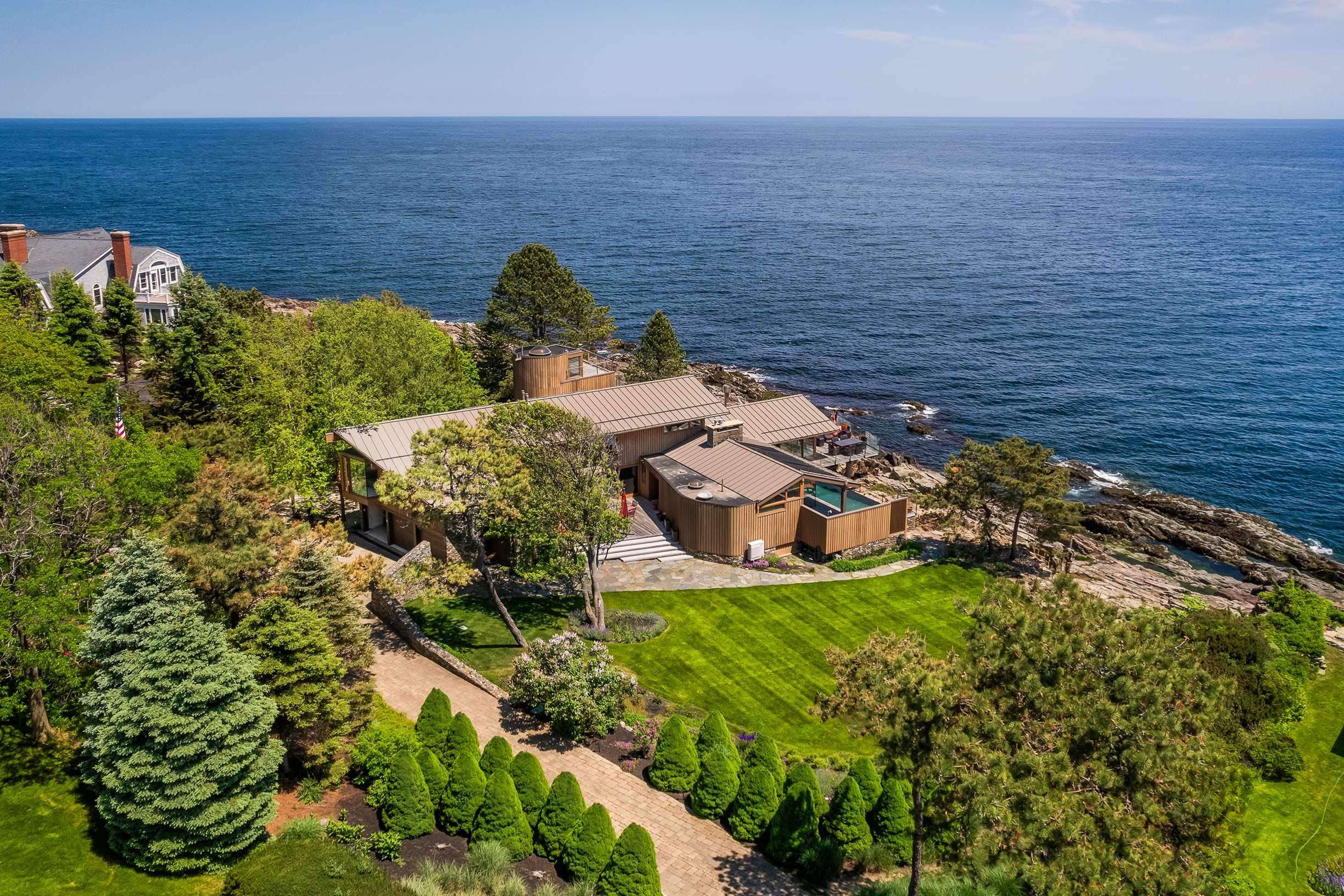This remarkable modern home is an architectural gem set on the rugged coast of Maine offering breathtaking ocean views. Set on a sprawling one-acre oceanfront property, the home boasts floor-to-ceiling windows that capture the mesmerizing ocean vistas, with a spacious deck that extends over the water. Upon entering the open living space, guests are greeted by a captivating ocean view from the living room, complete with a striking mid-century modern fireplace and sliding doors that open onto the deck. The heated infinity-edge pool beckons for relaxation and outdoor dining with friends and family. The gourmet kitchen is a chef's delight, featuring top-of-the-line appliances, rift-sawn oak cabinetry, and a stunning massive island with Zebrano wood veneer. An adjoining spacious dining area and a ''winter'' living room surround a floating library, defining the elegant spaces within the home. The two primary suites on the first level are characterized by massive interior sliding doors that seamlessly open or enclose the rooms. One of the suites boasts a fireplace and offers access to the ocean-side deck, pool, and spa. Ascending the handcrafted maple circular stairway, a lovely sitting room provides access to a private deck overlooking the picturesque seaside gardens. The second level features light-filled rooms perfect for various uses. This splendid residence is constructed with a sturdy masonry and steel structure.